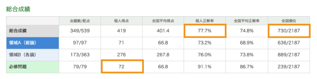 数値で成績を確認しましょう。必修個人得点、全国順位、個人・全国の平均正答率あたりは要確認ポイントです。